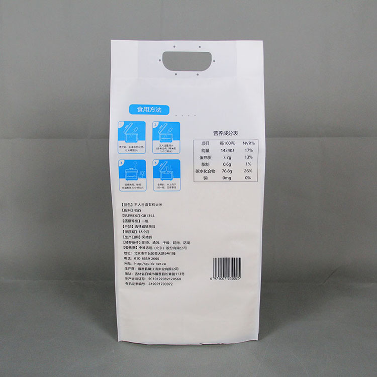 大米小米包裝袋有時候作為直接包裝,因此需要做成真空袋,又稱貼身防潮袋、鋁箔袋、鋁塑復合袋,其材質一般為PET/AL/CPE或PET/NY/AL/CPE.其中PET——印刷效果好,NY——透氧性低,AL——阻隔性強、不透光,CPE——包裝內層。膠水:水溶性膠水(更加衛(wèi)生、環(huán)保、無溶劑殘留量)此產品具有良好的防靜電、隔氧、屏蔽、防潮、遮光功能及優(yōu)良的熱封性。