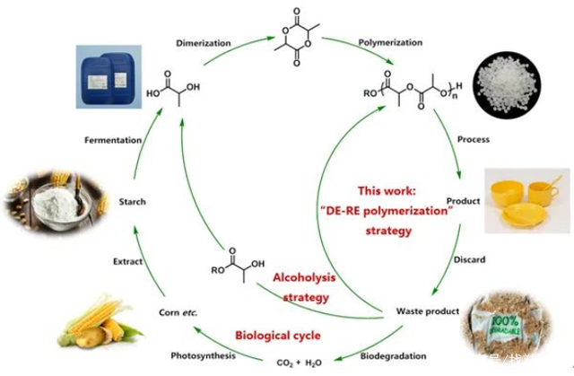 中國科學院青島能源研究所研究員王慶剛帶領的催化聚合與工程研究組發展出聚合物降解再聚合的升級化學循環新策略(“DE-RE polymerization”strategy),以“聚合物到聚合物”方式實現了聚乳酸廢棄物到新聚乳酸材料的循環再利用過程。該策略反應條件溫和,副反應少,減少了完全重新生產聚乳酸的原料消耗,提高了聚乳酸的回收再利用效率。在再聚合過程中,通過加入不同類型單體可以獲得性質各異的最終材料。