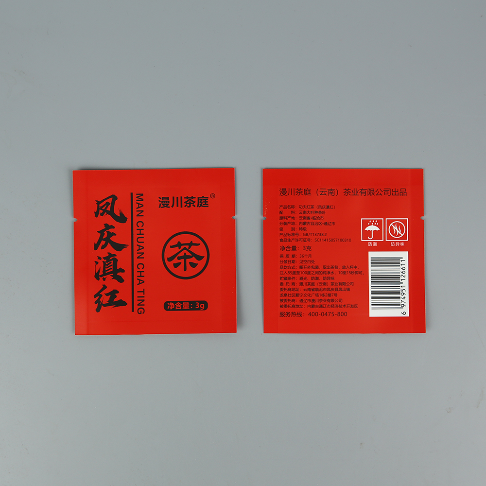 三層復合,表面PET、OPP為印刷層,中間層為PET鍍鋁,內層直接接觸茶葉的是PE或CPP。選擇表層為PET這種組合的優勢是,PET是沒有延伸性及耐高溫材料,在印刷時能保證不會因為伸縮而導致圖案位移;因為耐高溫,在熱封制袋的時候也不會因為高溫而變形;中間層的鍍鋁可以增加材質質感及有一定程度的遮蔽光線效果;內層PE是食品級可直接接觸食品的材料,并且具有很好的熱封性。