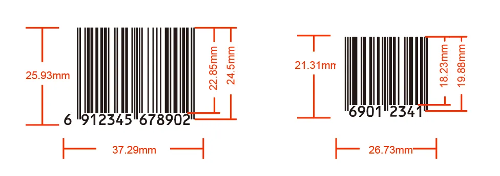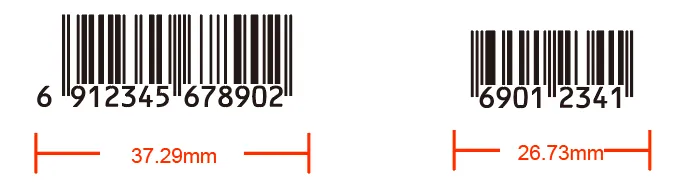 13位(EAN-13)條形碼的基本尺寸37.29x25.93mm,8位(EAN-8)條形碼的基本尺寸為26.73x21.31mm,原則上國家推薦縮放范圍為基本尺寸的80%~200%。